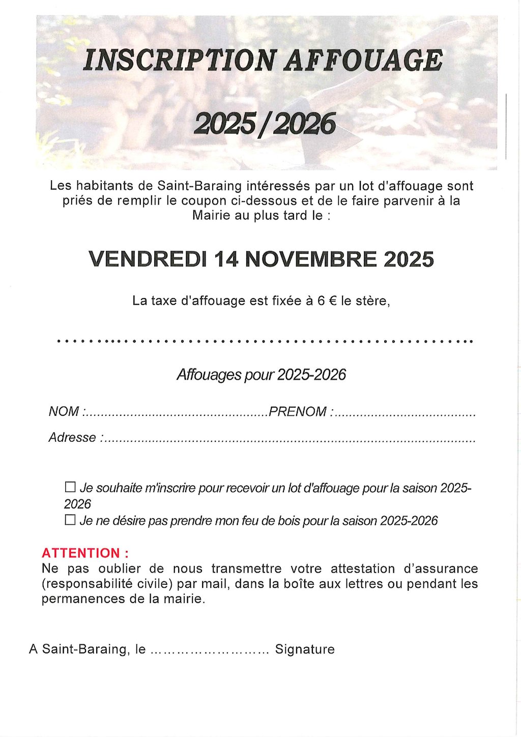 Les habitants de Saint-Baraing intéressés par un lot d'affouage sont priés de remplir ce coupon et de le faire parvenir à la Mairie au plus tard le vendredi 14 novembre 2025.