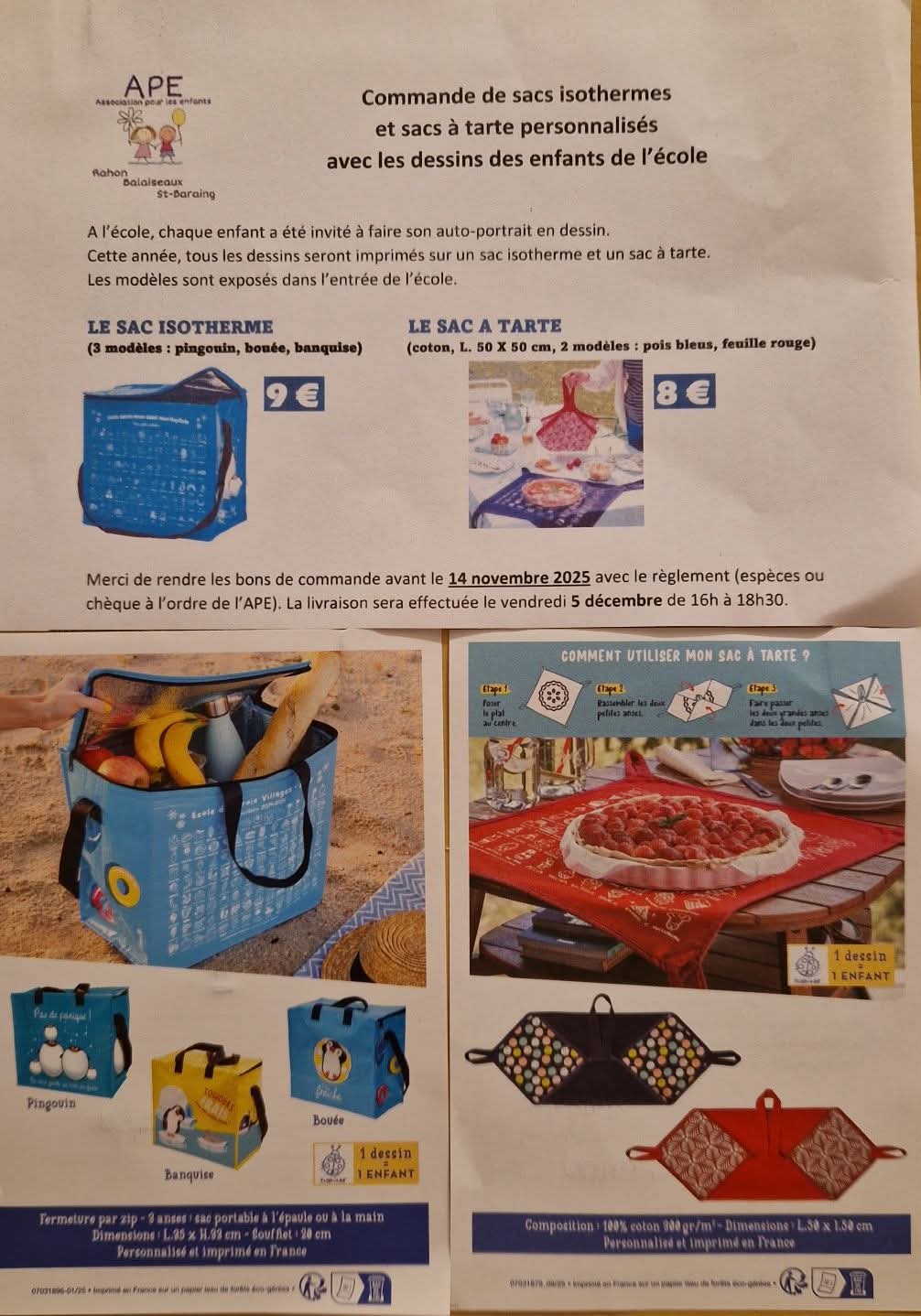VENTE DE SACS ISOTHERMES ET SACS À TARTE AU PROFIT DE L'APE DE L'ÉCOLE DE RAHON