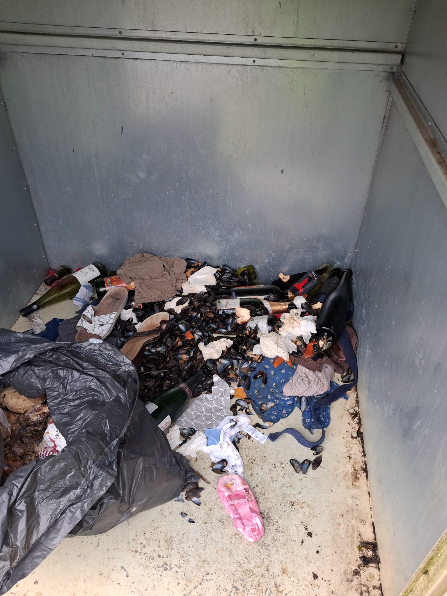 À cela s’ajoutent désormais des bouteilles abandonnées autour et à l’intérieur de la benne.